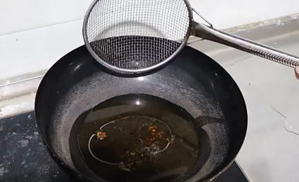 4. 出锅前,用漏网将多余的油花滤掉,使肉块更加酥脆。